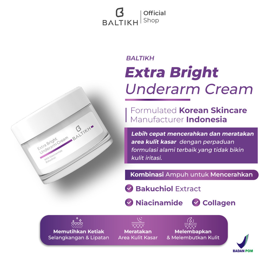 Baltikh Extra Bright Underarm Cream memastikan keamanan dan kualitas yang tinggi bagi penggunanya, menggabungkan inovasi dan perhatian pada detail dalam setiap aspek produksinya.
